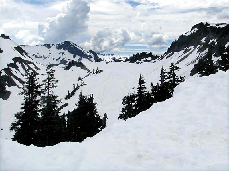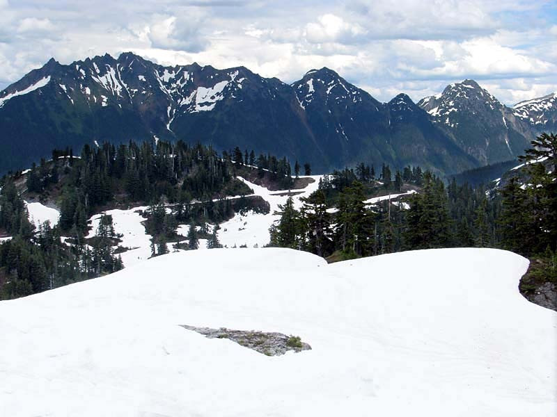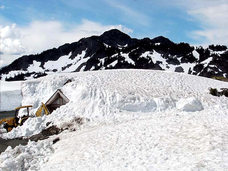 After Mount Rainier, Mount Baker has the heaviest glacier cover of the Cascade Range volcanoes; the volume of snow and ice on Mount Baker is greater than that of all the other Cascades volcanoes (except Rainier) combined. It is also one of the snowiest places in the world; in 1999, Mount Baker Ski Area, located 9 mi to the northeast, set the world record for recorded snowfall in a single season — 1,140 in (95 ft).